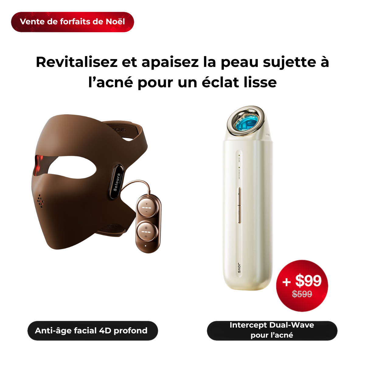 Du front au décolleté, JOVS offre un soin lumineux synchronisé sur trois zones où l’âge se révèle. Le masque laser 4D et le masque LED cou & décolleté ciblent le teint, la fermeté et l’éclat au-delà du visage.